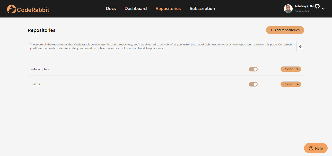 To add additional repositories after the sign-up, go to the repositories page within the CodeRabbit UI.
